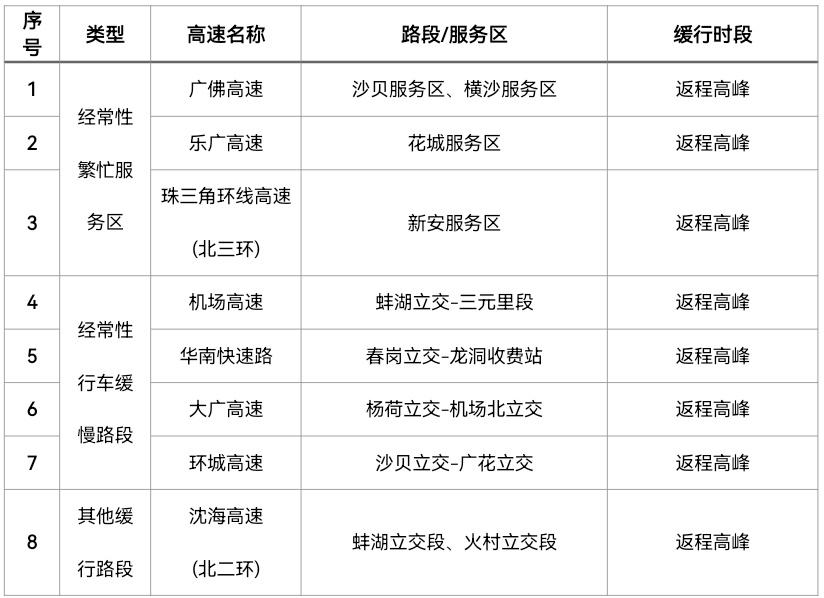 广佛高速沙贝服务区、横沙服务区、京港澳高速瓦窑岗服务区、广河高速正果服务区、大广高速从化服务区和吕田服务区、乐广高速花城服务区、北二环高速火村服务区及北三环新安服务区等高速服务区,高峰时段车流密集,可能出现车流倒灌影响主线通行。