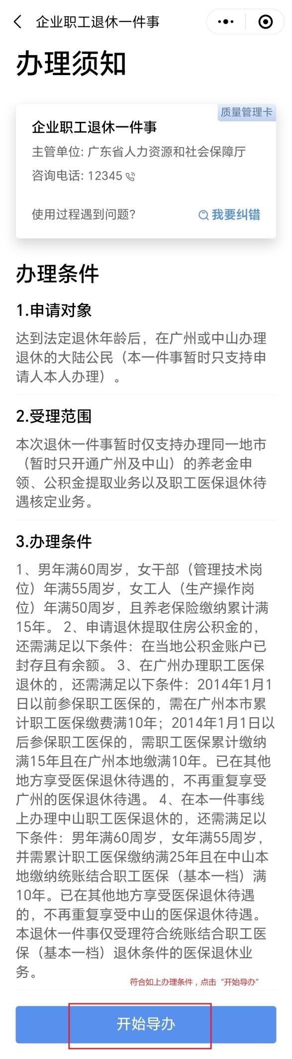 进入企业职工退休一件事申办页面,首先阅读办理须知,对办理条件进行自检,自检通过后点击“开始导办”。