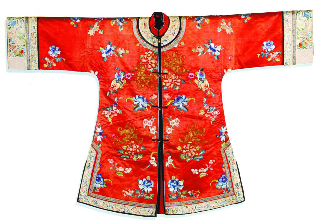 清末红缎地广绣金线绣花卉纹对襟汉式氅衣