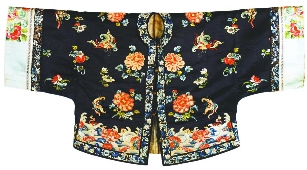 清末蓝缎地广绣花蝶纹对襟汉式氅衣