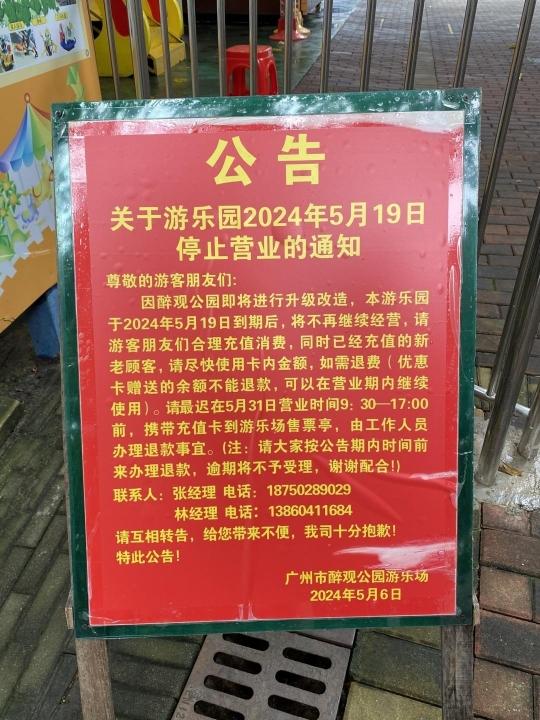 近日,位于广州芳村的醉观公园游乐场发布停业通知称,因醉观公园即将进行升级改造,游乐园将于2024年5月19日到期后,将不再继续经营,请游客朋友们合理充值消费,最迟在5月31日营业时间携带充值卡到游乐场售票亭办理退款事宜。继今年3月底位于广州海珠的晓港公园游乐场停业引发市民不舍后,又一公园游乐场停业消息引发关注。