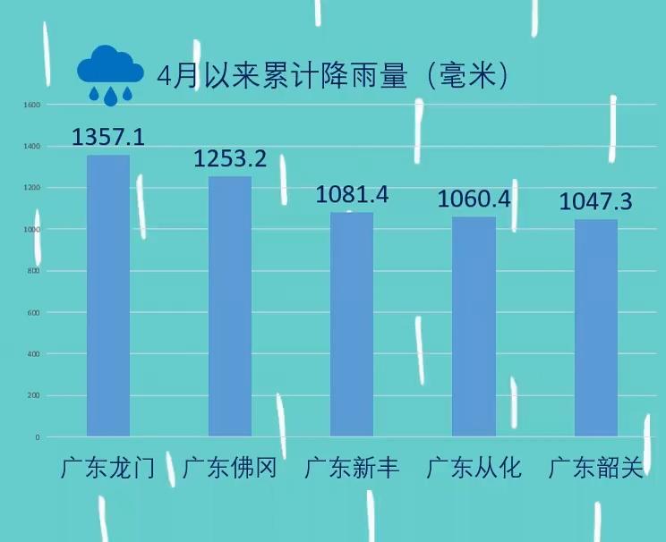 4月以来,全国累计降雨量超过1000毫米的站点:广东龙门、佛冈、新丰、从化、韶关,广东龙门累计降雨量1357.1毫米,位列全国第一。上述站点常年同期降雨量在280-350毫米之间,今年的雨量为历史同期排名第一。