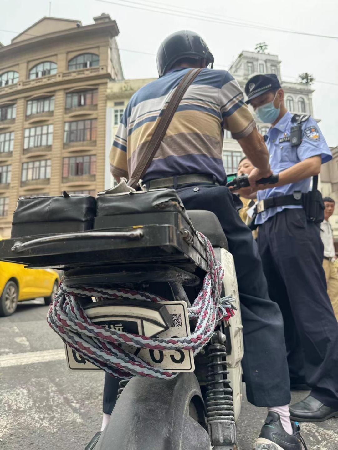 5月10日上午10时左右,北京路文明路路口东往西方向的车道上,两名外卖小哥因未按规定悬挂号牌相继被执勤交警拦下。