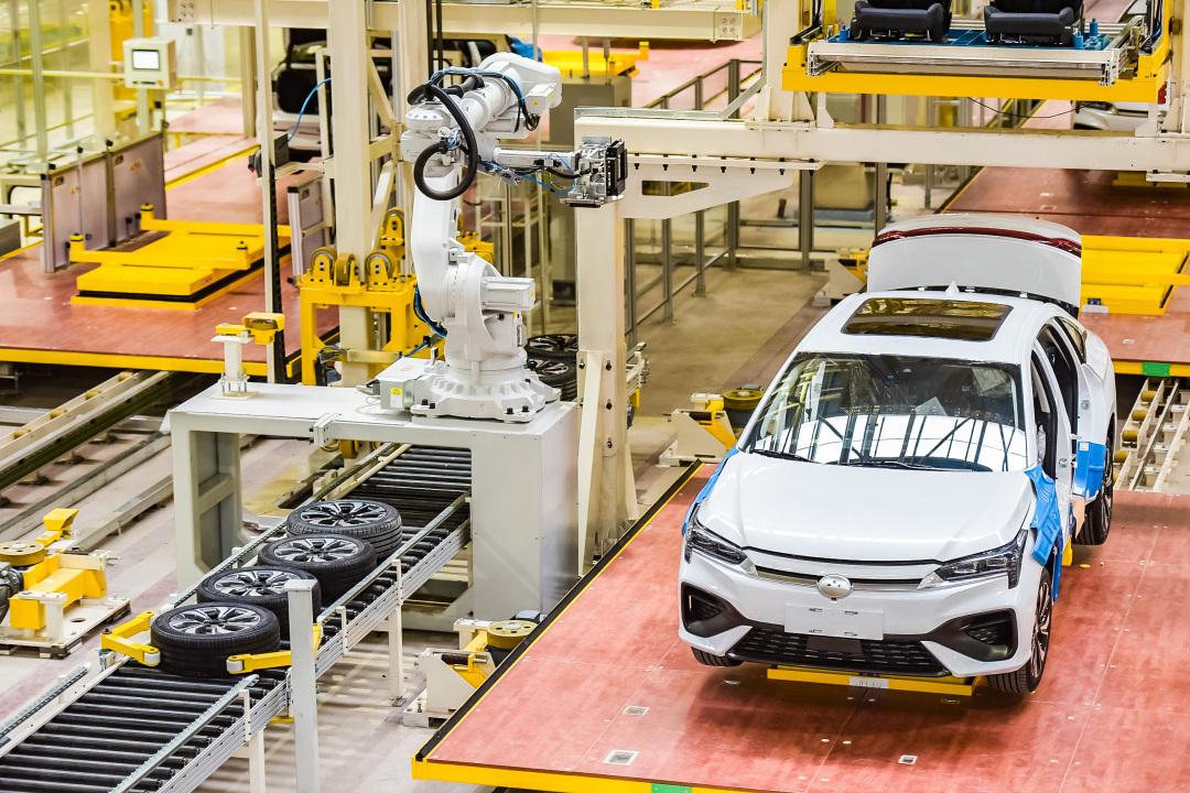 狮子洋畔,大江奔流潮头立。距离浮莲岗水道约2公里的广汽埃安智能生态工厂总装车间里,一片火热繁忙。机器臂飞舞,自动导向车来回穿梭,少量工人有条不紊地忙碌着,53秒就有一台车下线。