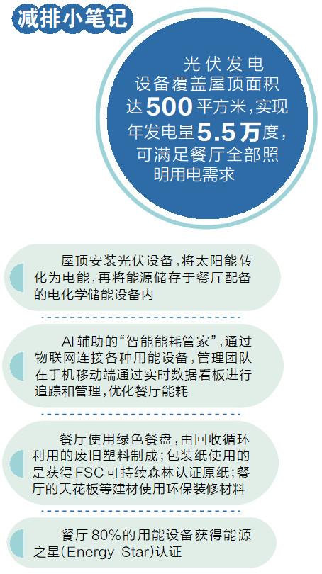 “零碳”不仅体现在能源利用方面,记者留意到,这家餐厅的餐盘不同于其他餐厅,使用的是绿色餐盘,由回收循环利用的废旧塑料制成;包装纸使用的是获得 FSC可持续森林认证原纸;餐厅的天花板等建材使用的是国际权威标准绿色卫士(GREENGUARD)环保认证的装修材料,在餐厅选址与设计、建材与施工尽量减少对环境的影响。