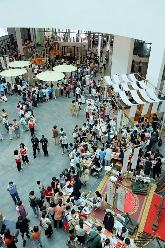 “博物馆小镇”沉浸式空间是本次广州主会场最大的亮点。自然光线从屋顶巨大穹顶倾泻而下,与白色弧形墙面一道将古色古香的小镇环抱其中,营造出既传统,又时尚的视觉效果。小镇分为驿站、珍宝斋、堡垒、集市、学堂、瓦舍、医馆、穿越隧道8大场景。近40家博物馆(院)及文化创意单位精心设计的摊位、活动共同构成科技量满满,体验感十足的“文创+”沉浸式街景。