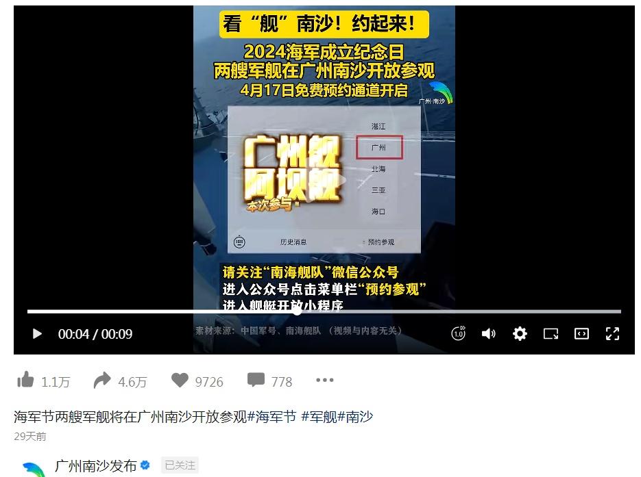 4月16日,“广州南沙发布”视频号发布《海军节两艘军舰将在广州南沙开放参观》称,2024海军成立纪念日,广州舰、阿坝舰两艘军舰在广州南沙开放参观,4月17日免费预约通道开启,并以图片标注的形式“指路”网络预约途径,标黄显示“预约程序4月17日15时正式上线运行,17日至18日每日放票一次”等票务信息。
