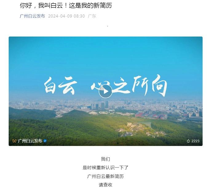 4月9日,“广州白云发布”微信公众号发布《你好,我叫白云,这是我的新简历》。文章首尾分别插播广州白云城市形象宣传片《白云 心之所向》、白云区城市形象主题曲《奔赴未来》,简历包括“我的名片”“我的证件照”“家庭成员”等主体部分,从“从前的我”到“现在的我”,再到“宜业”“宜居”“宜游”篇章,以图集、图文等形式介绍白云高质量发展成果。