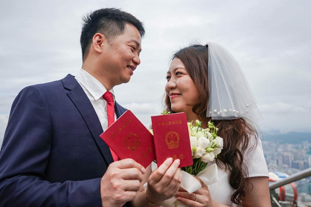 “无论贫穷还是富有,我们都将风雨同舟,不离不弃!”5月22日,在450米的高空之上,以城市天际线为背景,新人戴先生和太太在全国最高的婚登户外颁证点——广州塔结婚登记户外颁证点许下爱的誓言,进行了简约而不简单的领证仪式。