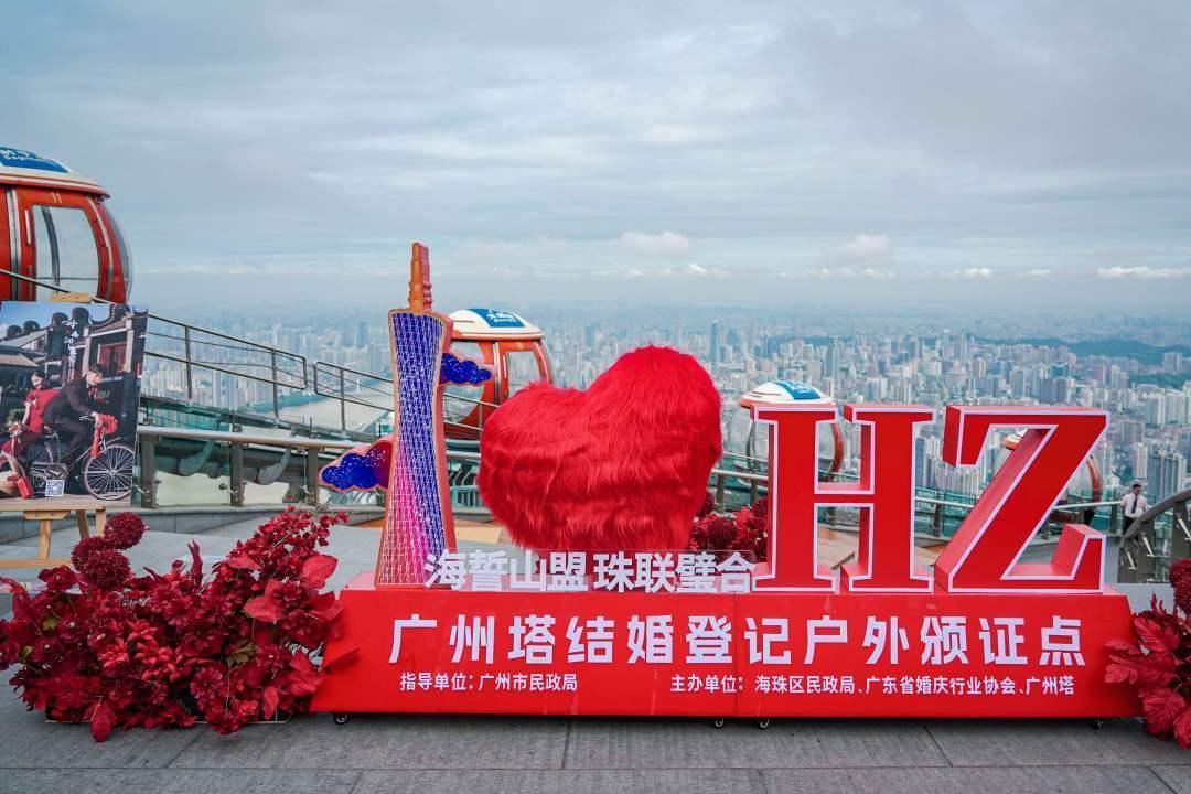 当日,广州塔结婚登记户外颁证点正式启用。广州市海珠区民政局携手广东省婚庆行业协会及广州塔管理方,在塔顶观景平台举办了“爱在云端”——广州塔最高结婚登记户外颁证点授牌仪式。