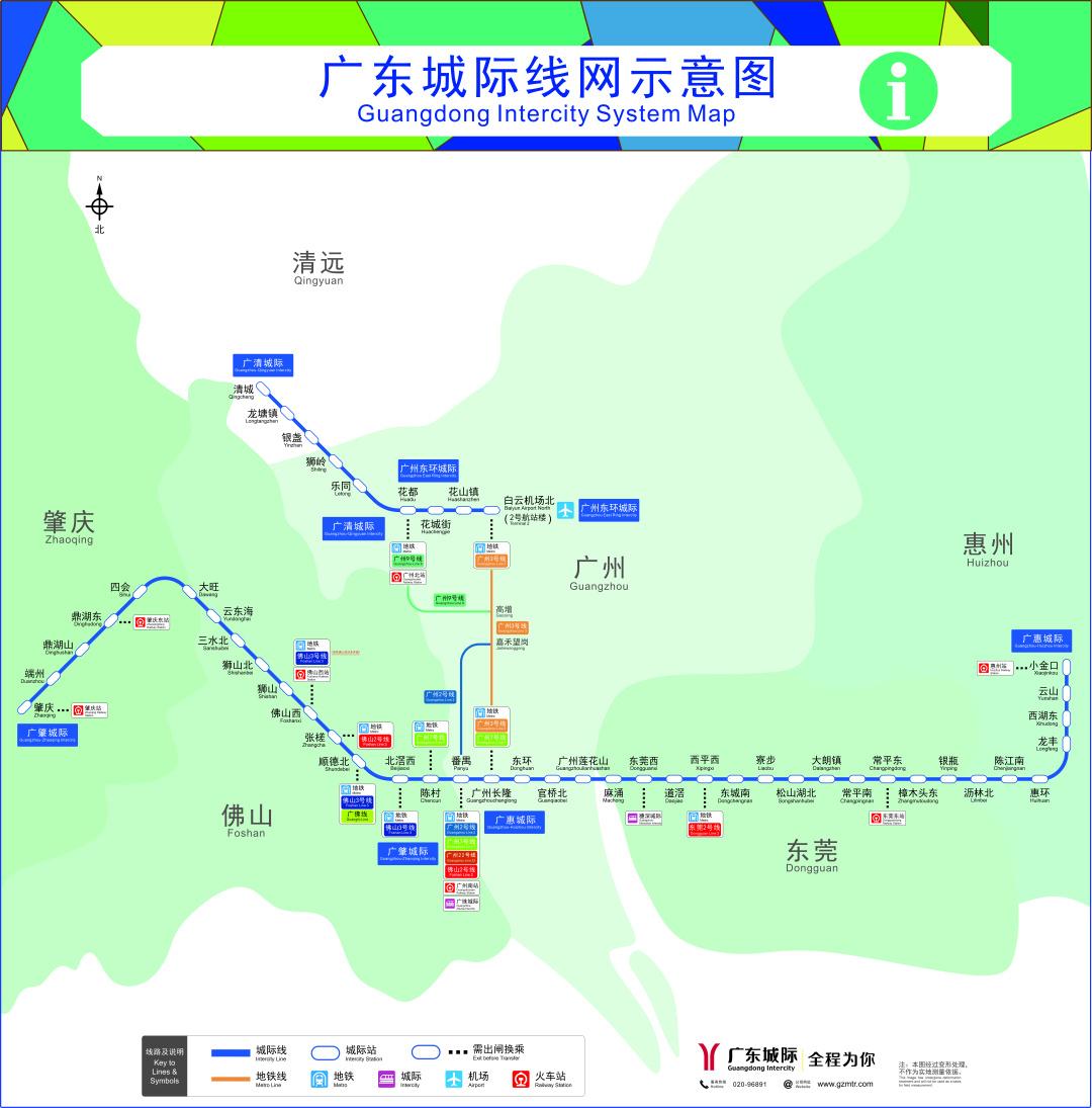 两条城际线路开通后,由广州地铁集团运营的城际铁路里程将达318.6公里,并以番禺站为中心,向西为广肇城际,向东为广惠城际,连通广州、佛山、肇庆、东莞、惠州,大大加强广州与周边城市的交通联系,持续发挥轨道交通作为经济大动脉的牵引作用。从线路图上可以看到,全线共设39座车站,其中,广州5座、佛山9座、肇庆6座、东莞12座、惠州7座,列车最高运行时速为200公里。