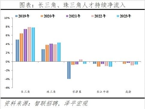 得益于雄厚的经济基础和较高的战略定位,东部人才持续集聚,中部、西部、东北持续净流出。超6成人才流向五大城市群,长三角、珠三角人才持续集聚,京津冀人才转为净流出趋势,成渝、长江中游人才持续净流出。其中珠三角人才流入占比小幅上升,流出占比从11.1%降至9.9%,人才净流入占比从2.8%增至4.3%。不过与2019年相比,2023年五大城市群人才流动性下降,2019-2023年五大城市群合计人才流入占比从63.1%降至60.6%,人才流出占比从59.8%降至51.4%。