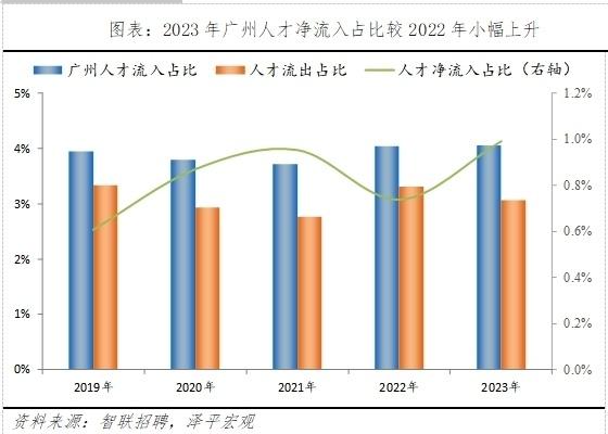 报告显示,广州2019-2023年人才净流入占比分别为0.6%、0.9%、1%、0.7%、1.0%,人才持续集聚,主因广州经济发展速度快,生活成本、房价在一线城市中最低。