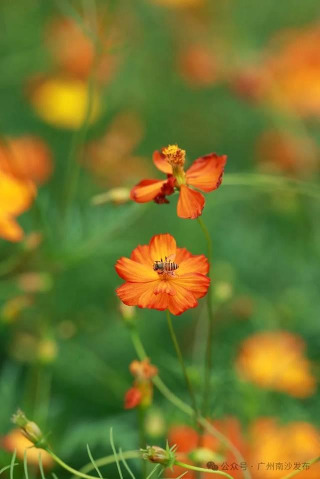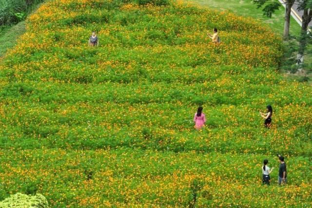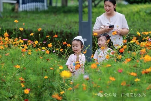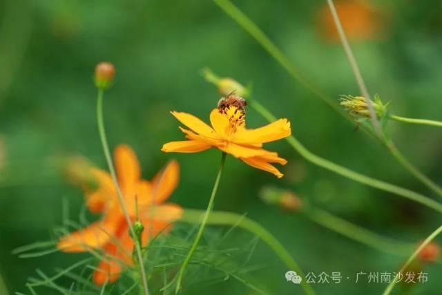 青山碧水的恬静温和与橙黄色黄花波斯菊的浪漫活泼,合奏成南沙夏天的乐章。