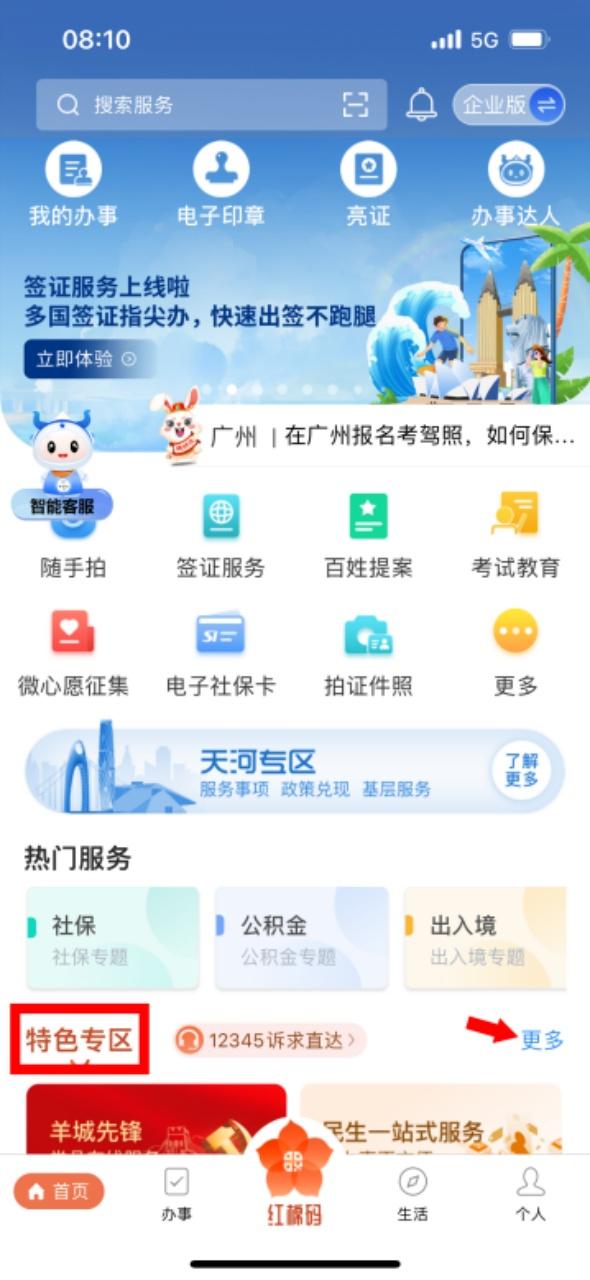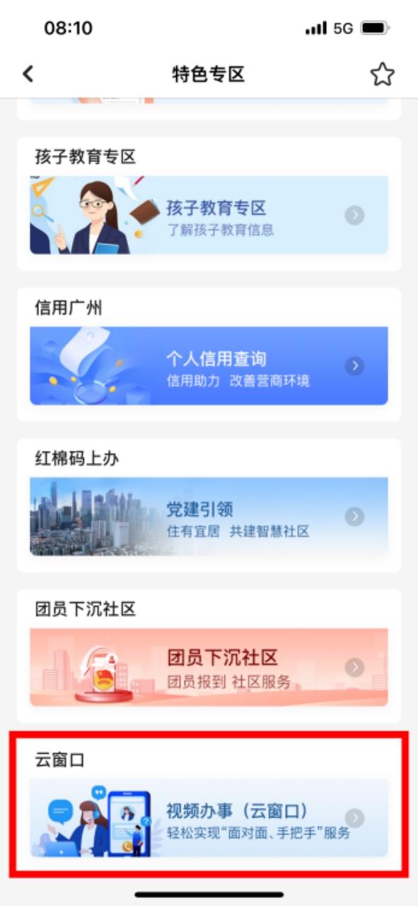 1.登录“穗好办”APP,点击主页【特色专区】的“更多”,选择【视频办事(云窗口)】。
