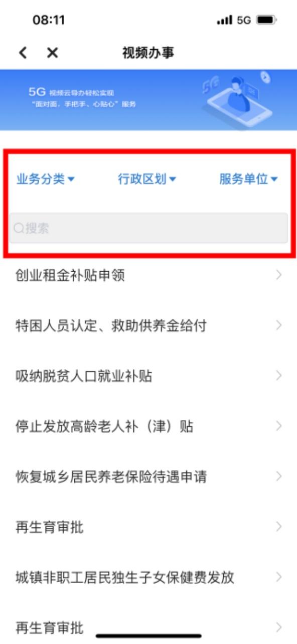 2.进入【视频办事(云窗口)】,在页面上方,可根据业务分类、行政区划、服务单位、关键字来进行筛选所需咨询的服务,点击需咨询的服务,可进入咨询页面。