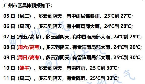 展望周五到下周一(高考、端午假期期间),广州降雨有所减弱,有雷阵雨局部大雨。
