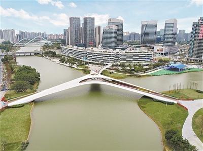 大洋网讯 近日,随着融通大厦前人行桥、喜来登酒店前人行桥的桥面附属及园林绿化施工完成,由中铁广州局集团承建的广州南沙创享湾人行桥及周边功能完善工程取得新进展,五座人行桥已全部建成并通行。