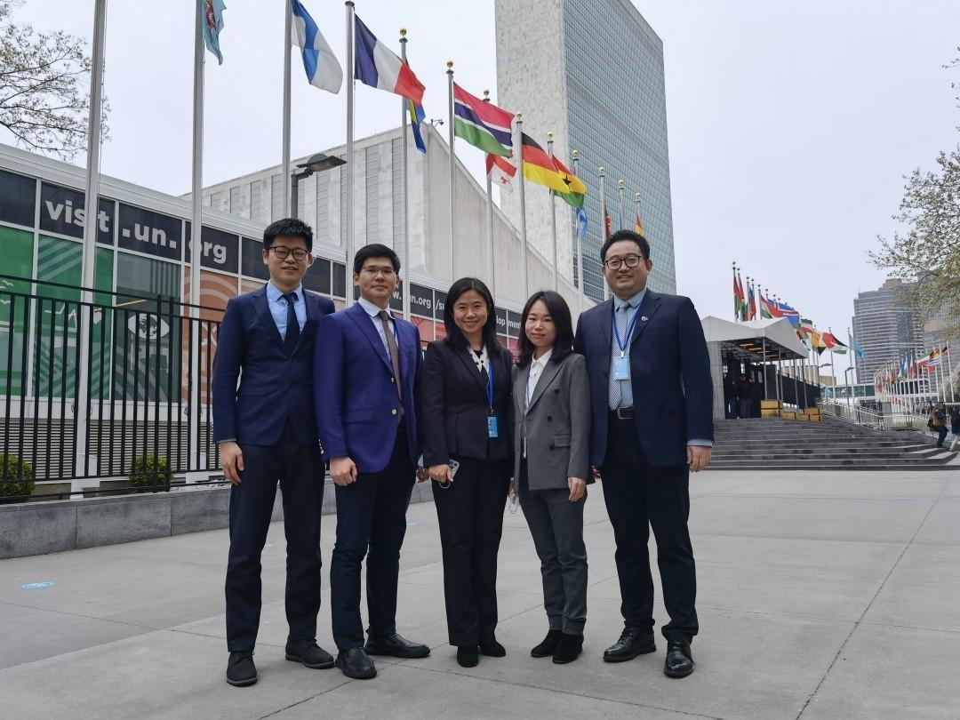 在联合国纽约总部大楼前合影(右二为陈斐媛)。