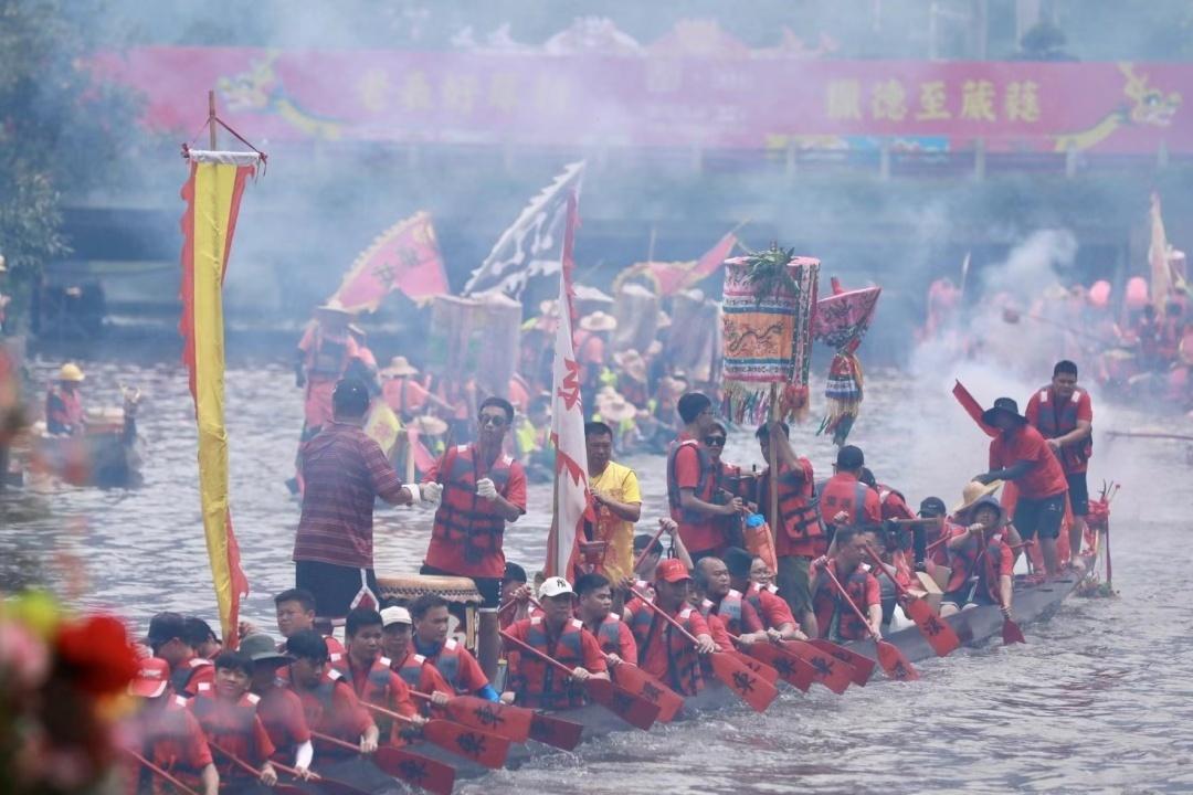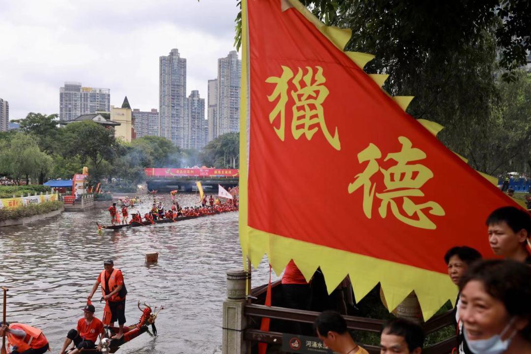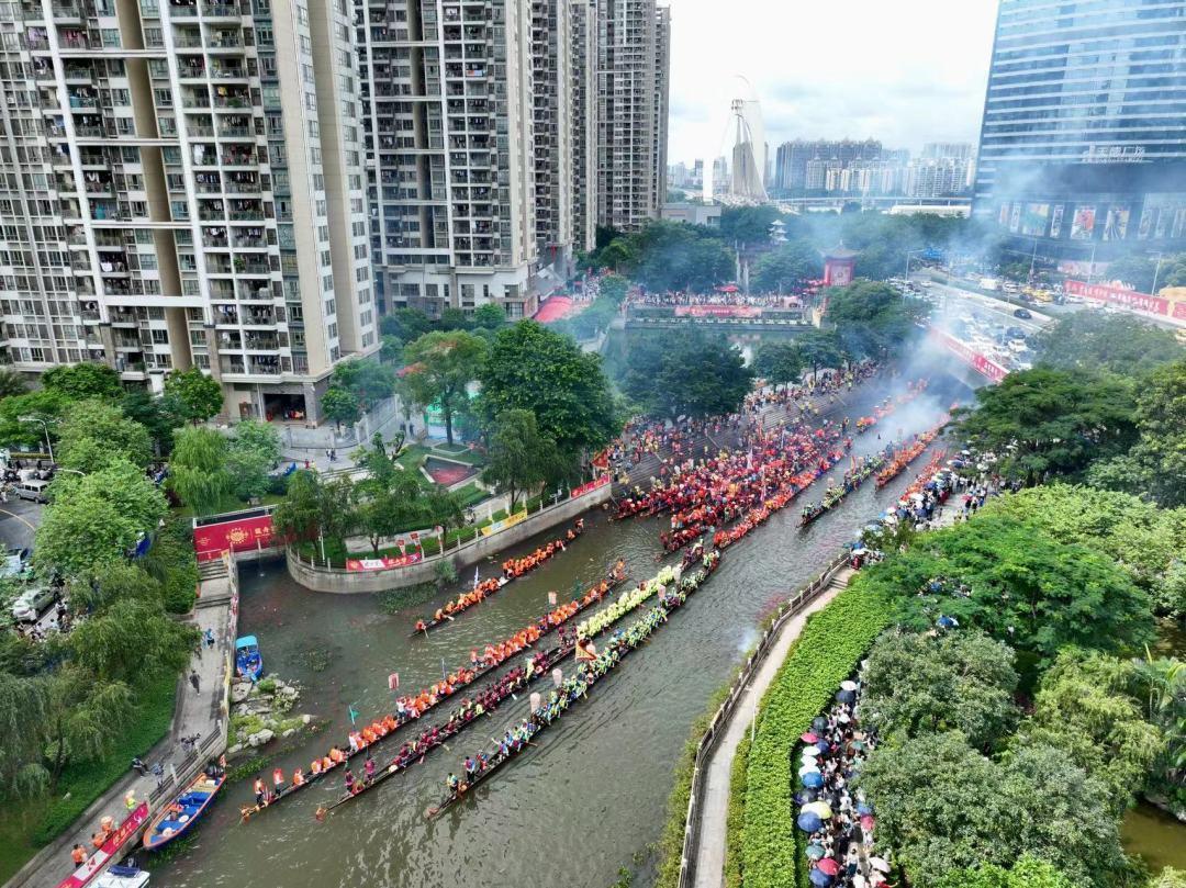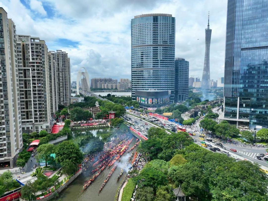 6月10日(农历五月初五)端午节,广州市天河区珠江新城热闹非凡。上午9点,上百艘龙船沿着珠江水网接踵而来,龙舟争流竞渡,猎德涌两岸彩旗飘扬、人潮涌动,锣鼓声、鞭炮声、呐喊声响彻两岸,一片欢欣。