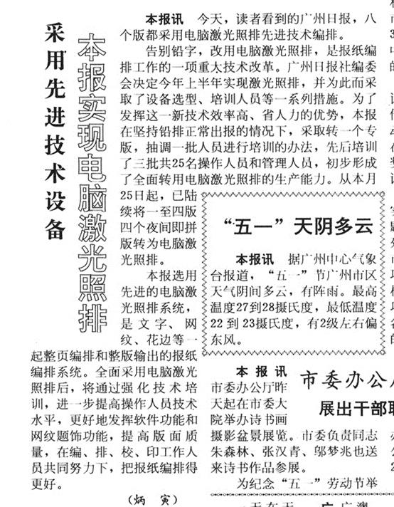 1991年4月30日,《广州日报》刊登消息:今日八版全部采用电脑激光照排。自此,广州日报正式进入电脑排版时代。