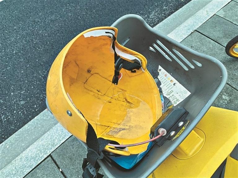 记者留意到,除了无牌照之外,万想物等大部分品牌的共享电单车都没有配备头盔,如果驾驶者不佩戴头盔上路,将违反道路交通安全法。有的共享电单车即使配备了头盔,但也是破损或邋遢不堪。在智行小拜的车辆上,有的头盔安全扣无法扣上,有的保护胶带断裂暂缺,根本无法正常保护驾驶者头部安全。