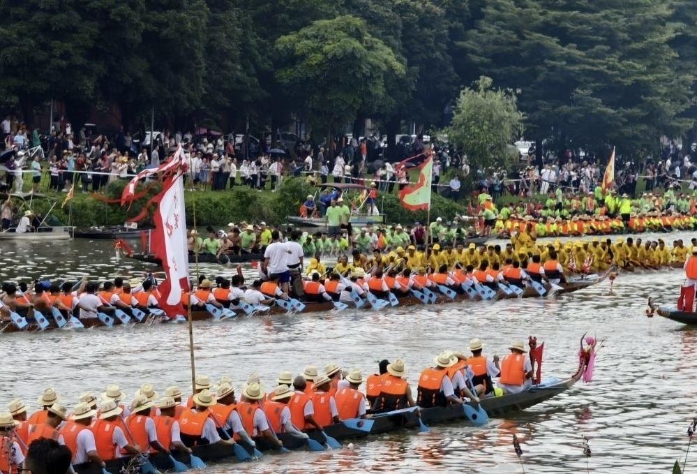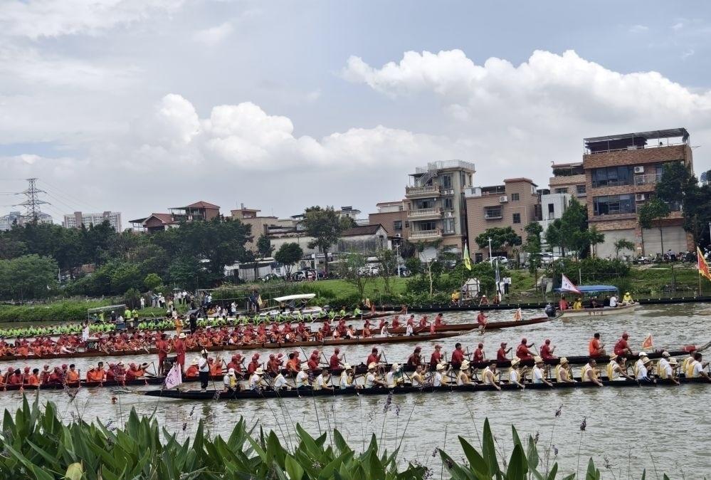 6月12日(农历五月初七),广州市番禺“十乡龙船会”北海景在番禺市桥水道北岸市桥三桥至莲湖生态公园水域举行,与此同时,市桥水道南岸的“沙湾龙船会”也在这段水域举行渡头景,水面上汇聚了50多艘颜色各异的龙船巡游、竞渡,吸引了沿岸过万名市民群众观看。