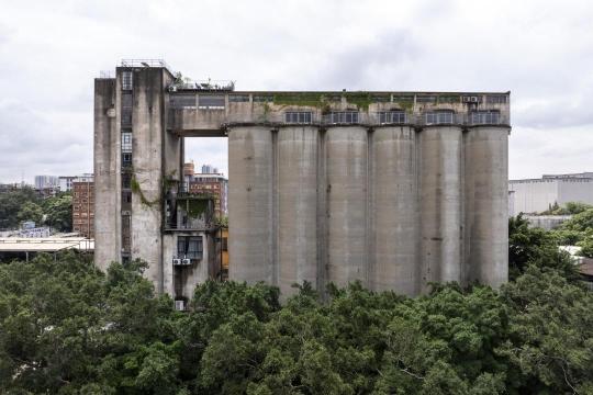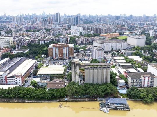 “捷克楼”对面的麦仓,是园区的另一处地标,也是园区的制高点。38米高的麦仓,静静坐落在珠江支流增埗河岸边,四壁白墙,两排高窗,12个混凝土圆筒仓顶上有一个58米×7.5米的长盒子空间。据介绍,麦仓建于20世纪60年代,麦子通过水路运至岸边,自下而上输送到顶层储存,由地面的方形洞口泻入筒仓,取用时从下面打开即可。