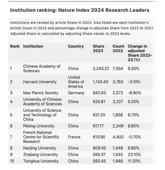 日前,出版科学杂志《自然》的施普林格·自然集团发布2024自然指数研究领导者(Nature Index Research Leaders 2024,此前称自然指数年度榜单),其中,中国科研机构的表现亮眼,中国科学院继续位列全球首位,已连续12年居于榜首。中国科学院大学、中国科学技术大学排名升至全球第四、五位。