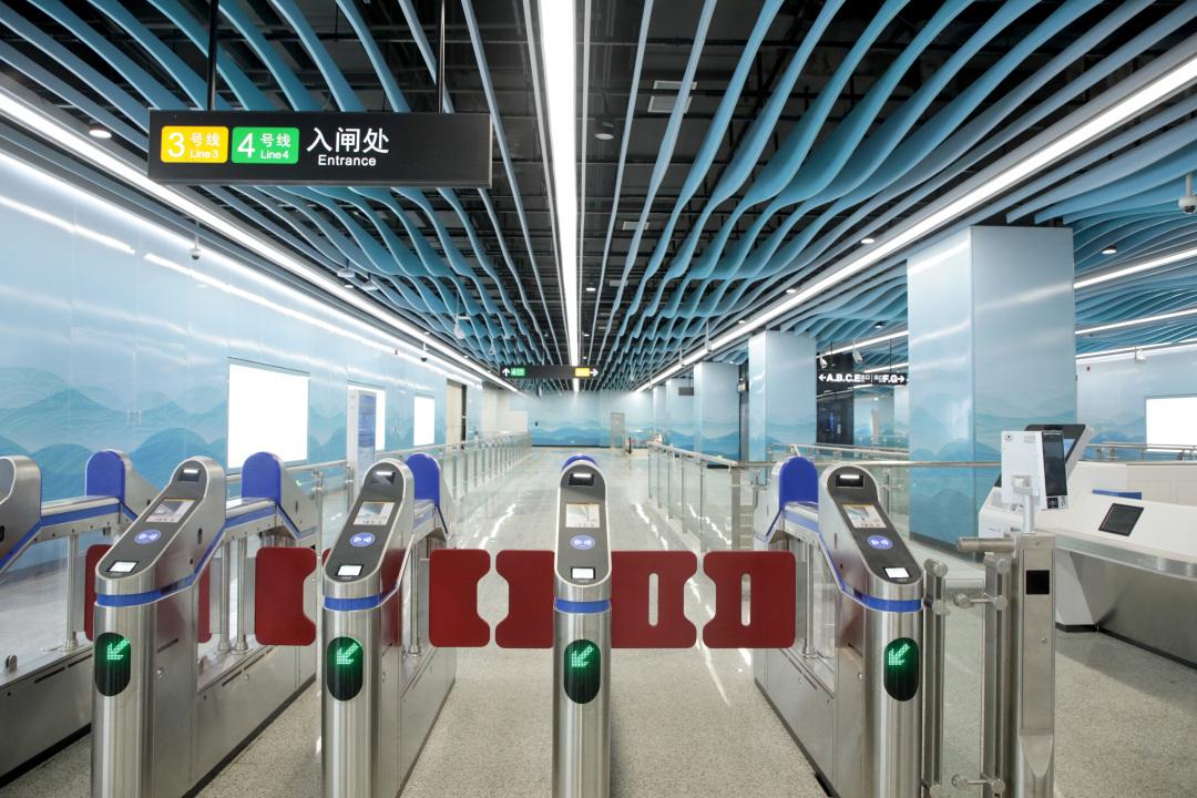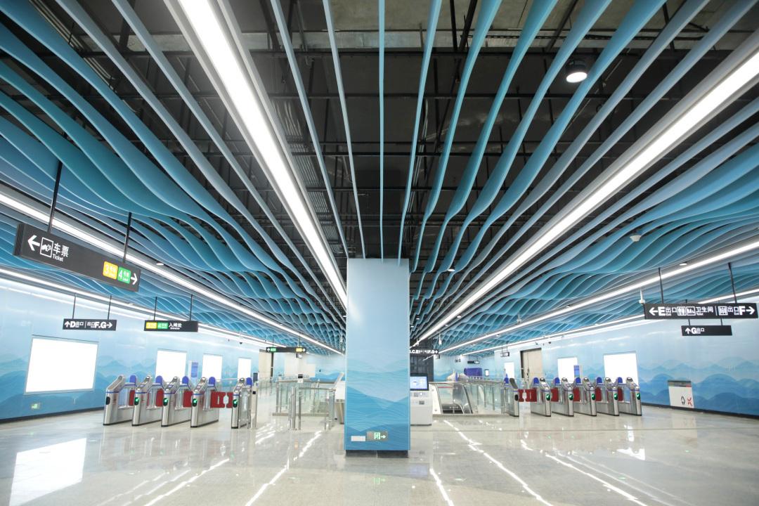 作为四个新建车站中的主题设计站,海傍站以“逐水傍海”为整体设计主题,天花采用了渐变色的波浪造型垂片,墙面使用的搪瓷钢板也特别增加了国风水彩波浪图案,地面则通过拼花石材营造“海傍”的氛围,给乘客带来浓郁的沙田水乡风情视觉体验。