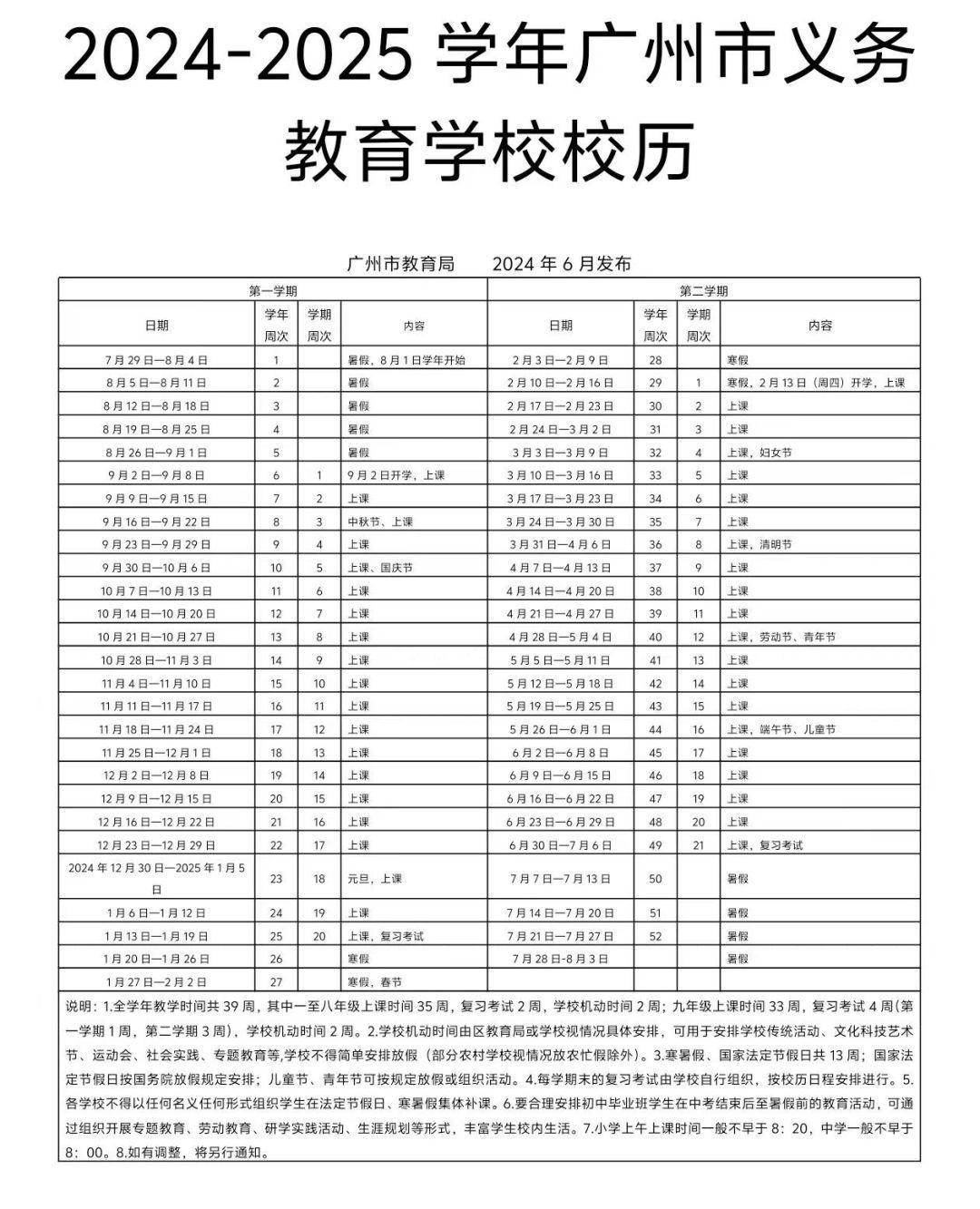 6月28日,广州市教育局发布《关于印发2024-2025学年普通中小学校校历的通知》(以下简称“《通知》1”)和《关于印发2024—2025学年广州市中等职业学校校历的通知》(以下简称“《通知》2”),公布《2024-2025学年广州市义务教育学校校历》《2024-2025学年广州市普通高中学校校历》和《2024—2025学年广州市中等职业学校校历》,明确中小学校和中职学校9月2日结束暑假正式开学,其中高三学生8月1日开始新学年上课,2025年2月13日(周四)结束寒假正式开学上课。