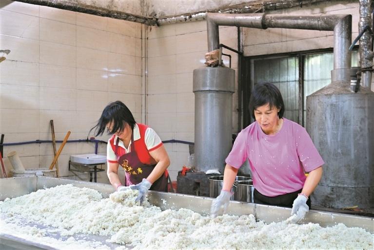 潘翠芳(右)正在将酒曲加入煮熟的大米中搅拌。