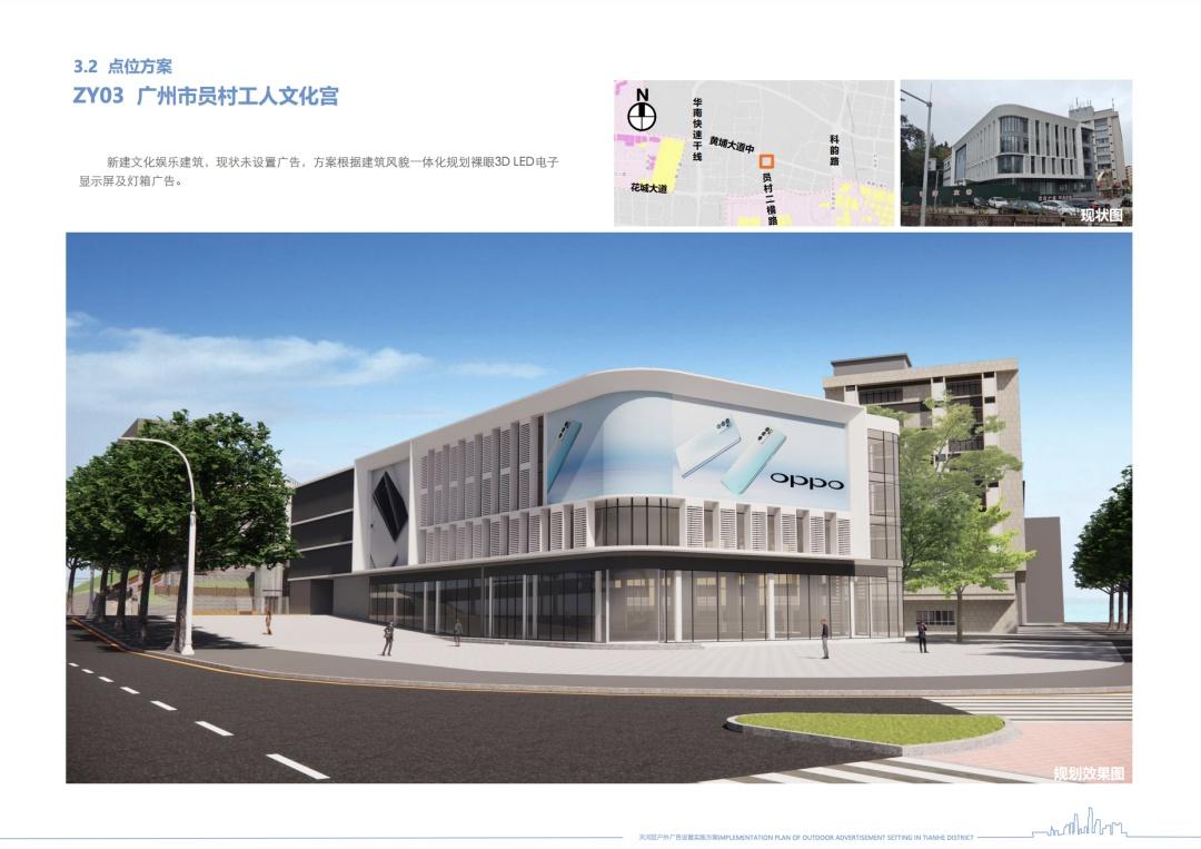 广州市员村工人文化宫位于员村二横路2号,新建文化娱乐建筑,现状未设置广告,方案根据建筑风貌一体化规划裸眼3D LED电子显示屏及灯箱广告。