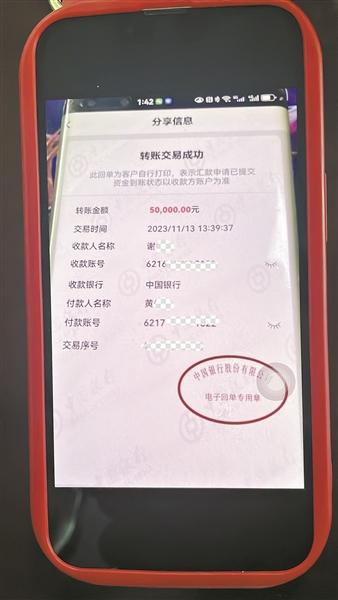 2023年12月14日,在经历了客户打款、账户冻结近一个月后,谢女士按照办案民警的要求,将5万元返还给了黄某某。随后,谢女士的账户便解冻恢复正常。