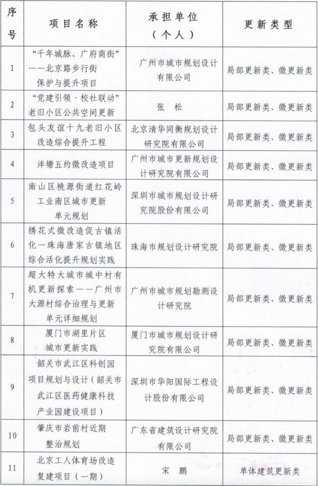 广州4个项目入选,其中“局部更新、微更新类”3个:泮塘五约微改造项目,“千年城脉、广府商街”——北京路步行街保护与提升项目,超大特大城市城中村有机更新探索——广州市大源村综合治理与更新单元详细规划;“城市更新研究、城市更新运营类”1个:广州“身边项目·全民设计”城市更新实践。