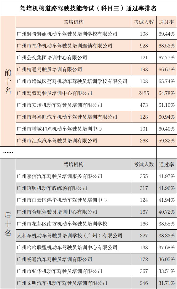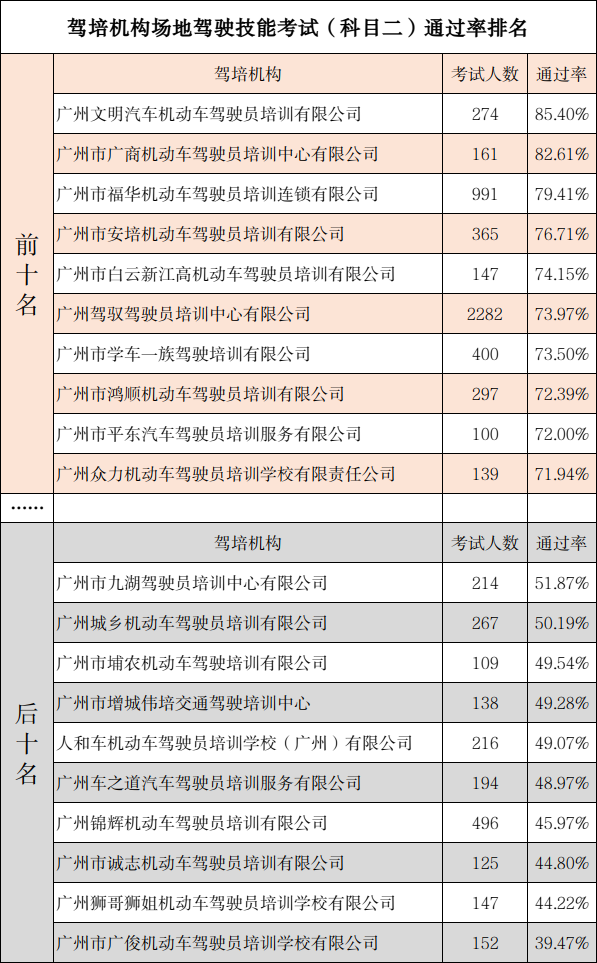 考试通过率方面,6月广州市场地驾驶技能考试(科目二)通过率最高的机构的通过率为85.40%,通过率最低的机构的通过率为39.47%;广州道路驾驶技能考试通过率(科目三)通过率最高的机构的通过率为69.44%,通过率最低的机构的通过率为31.71%(前后十名,考试人数小于100人的驾培机构不纳入统计)。