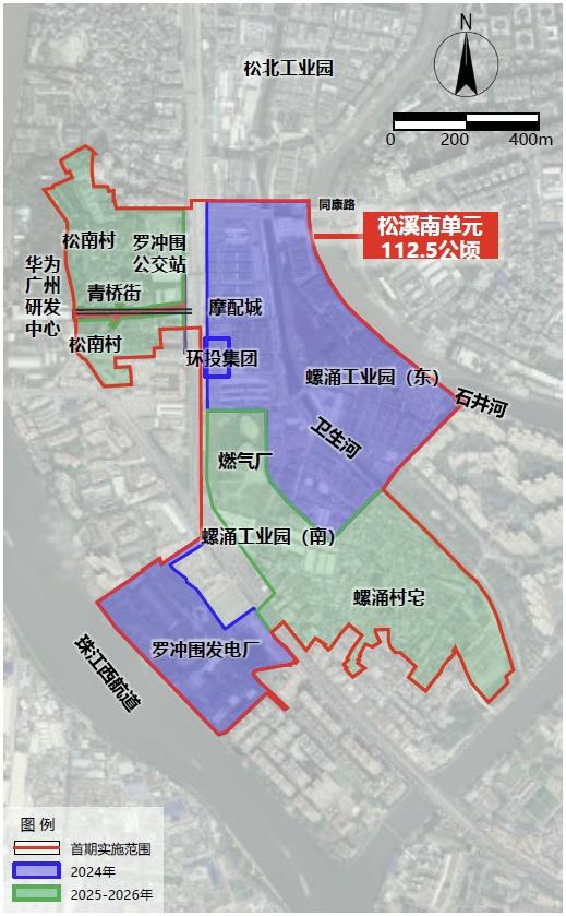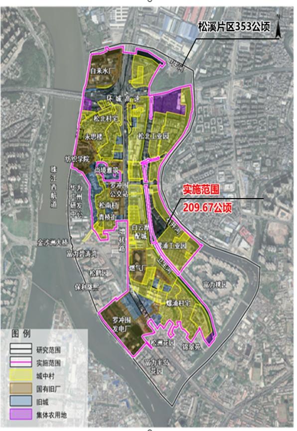松溪片区的螺涌村、松南村、松北村城中村改造,北至卫生河,西至珠江,南至增埗河,东至石井河,改造范围约353公顷,实施范围约209.67公顷,首开区实施范围约53公顷(具体范围及情况以项目改造方案为准)。