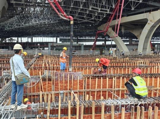 7月28日,经过各参建单位40小时连续奋战,广州白云国际机场三期扩建工程交通中心项目高架桥首联现浇梁混凝土顺利浇筑完成,标志着项目高架施工进入上部结构作业新阶段。预计9月30日,白云机场交通中心高架桥东侧达到通车条件节点,为3号航站楼(T3)装修的全面铺开提供施工通道。
