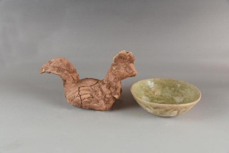 唐代墓葬中出土的陶鸡及青瓷碗(按出土位置摆放)
