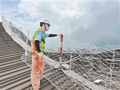针对屋面施工的高空作业,监理尤其关注安全细节,从安全绳是否牢固、到安全兜底网是否结实,再到辅助的钢丝绳质量,全部都要逐一检查。监理特别要求,高空作业前不能喝酒,现场设有酒精测试仪。如果体检报告显示工人有心脏等相关疾病,同样不允许施工。