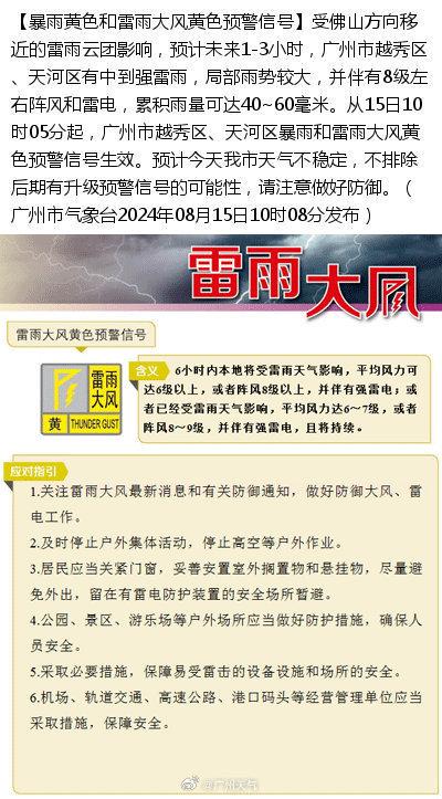 从15日10时05分起,广州市越秀区、天河区暴雨和雷雨大风黄色预警信号生效。预计今天我市天气不稳定,不排除后期有升级预警信号的可能性,请注意做好防御。广州市气象台08月15日10时05分发布。