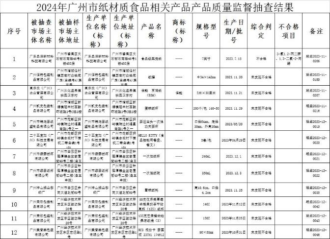 附:2024年广州市纸材质食品相关产品质量监督抽查结果