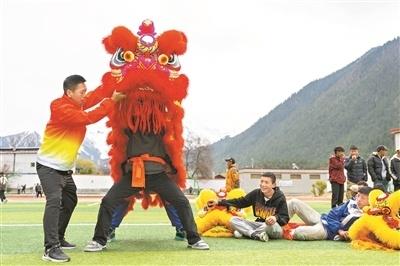 广州北胜蔡李佛传承基地专业教练在教波密县中学的学生舞狮。