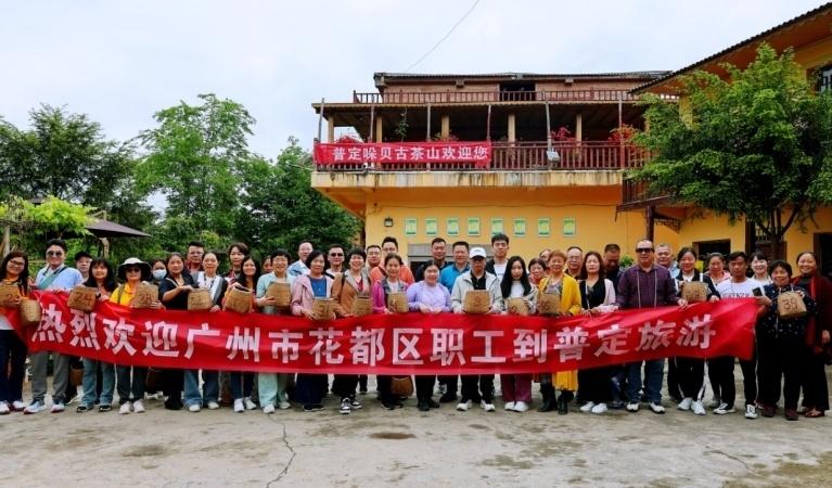 走进哚贝古茶山,垄垄茶树冒出嫩芽,翠绿欲滴,职工游客们穿梭其间,采茶、制茶、品茶,不亦乐乎。三地工会积极发动当地特色景点项目,不仅依托黄果树瀑布等知名度高的大景,还充分发掘自然资源和人文景观,串联了大峡谷、古茶山、化石群等小众景点,为花都职工游客提供了打糍粑、拦门酒、竹竿舞、扎染、篝火晚会等互动式项目,村民们在家门口就能吃上生态“旅游饭”。