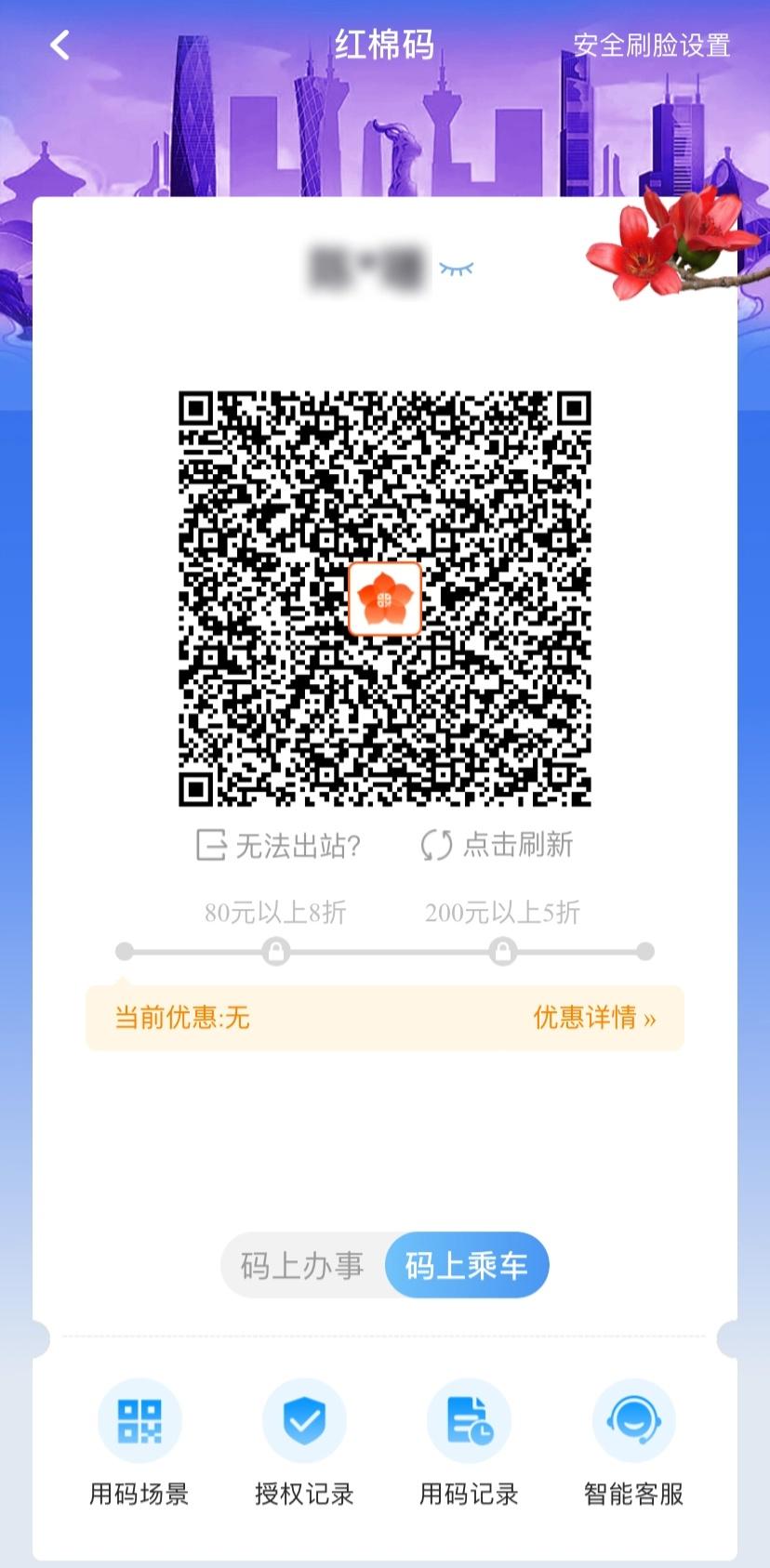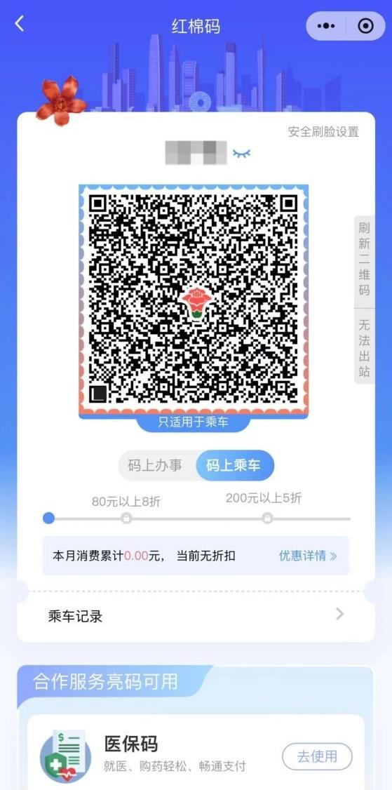 另外,根据《广州市公共交通票价优惠调整方案》,普通乘客在一个自然月内,乘坐广州地铁公交累计实际支出票款满80元不满200元部分享受8折优惠;超出200元部分享受5折优惠。使用穗好办·红棉码乘车功能,可享受该优惠。需注意的是,不同入口不能实现汇总累加,乘客须在一个月内使用同一平台同一入口的乘车码方可累计优惠。