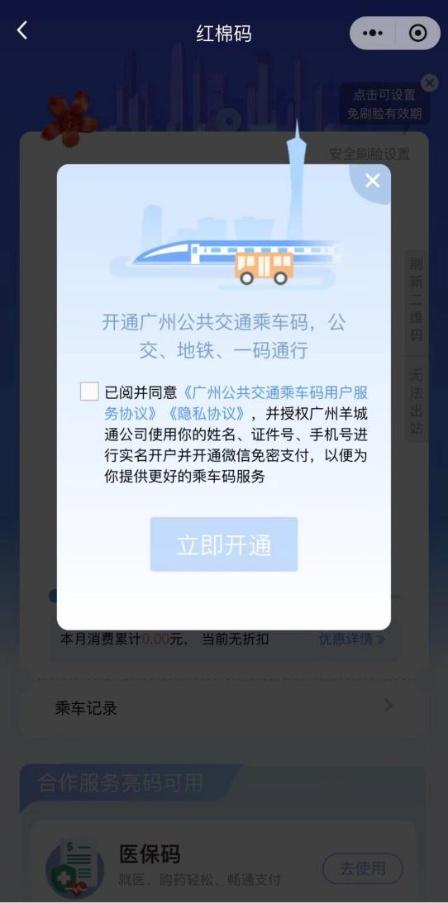 需要注意的是,初次使用穗好办·红棉码时,需签约开通广州公共交通乘车码。点击“立即开通”即可办理签约。