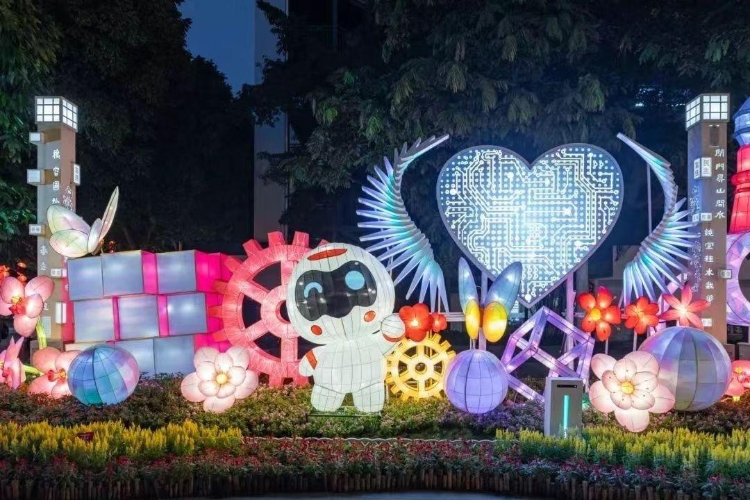 花灯点点、荷叶田田、荷花袅袅,微风吹过泛起层层涟漪。此组灯结合“泮塘五秀”五种水生植物,复刻古人夜放水灯的浪漫景象,寄托了人们对美好生活的向往。
