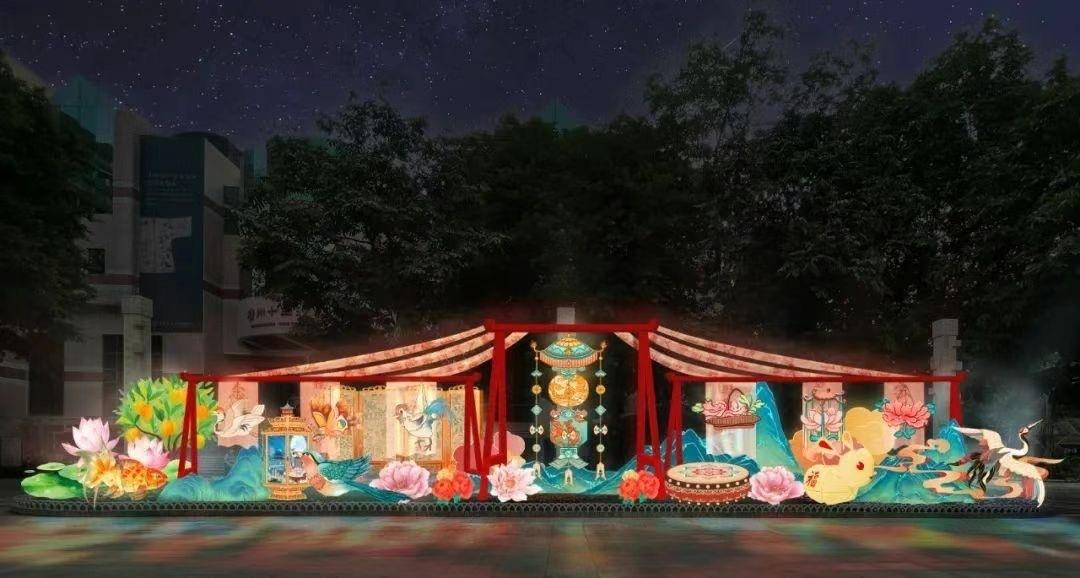 采用幻彩透纱材料制作而成,新材料的运用给传统的非遗彩灯艺术增添了鲜活的感染力。