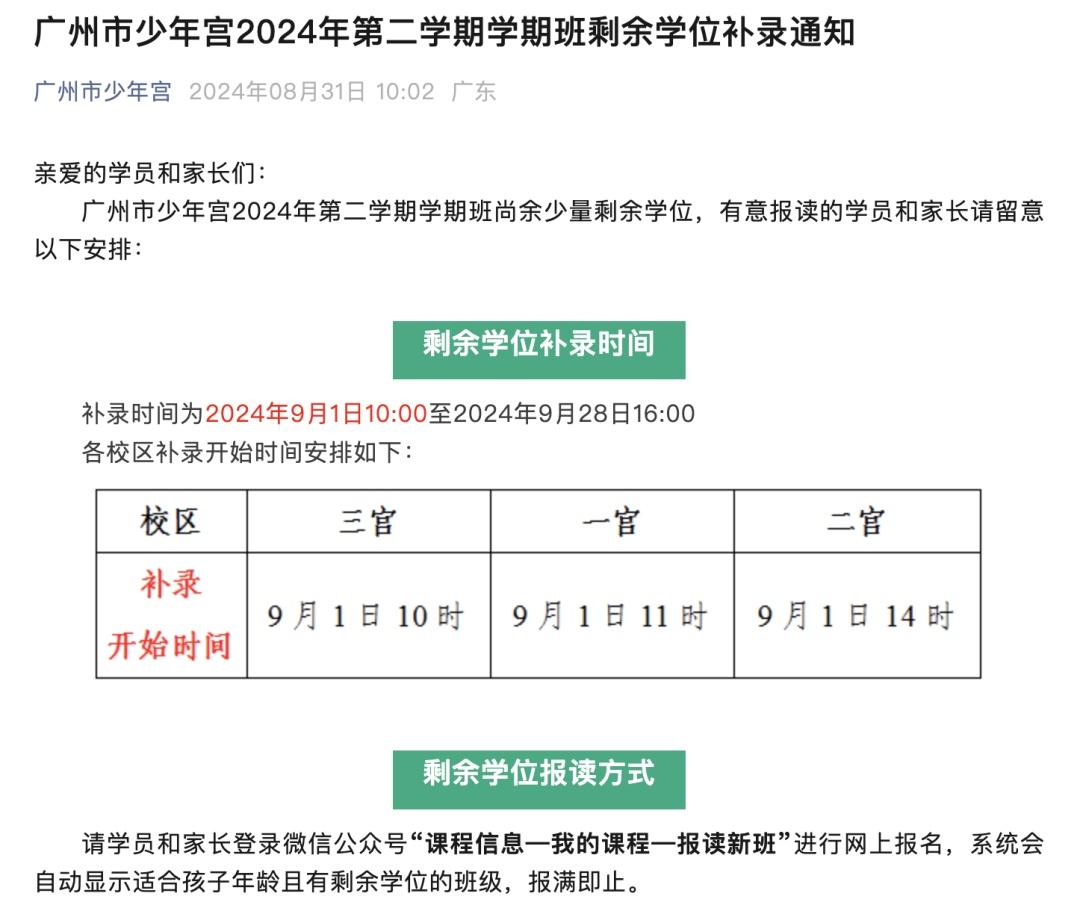 8月31日,广州市少年宫发布通知称,广州市少年宫2024年第二学期学期班尚余少量剩余学位。剩余学位补录时间为9月1日10:00至9月28日16:00。学员和家长可登录市少年宫微信公众号进行网上报名,系统会自动显示适合孩子年龄且有剩余学位的班级,学位报满即止。