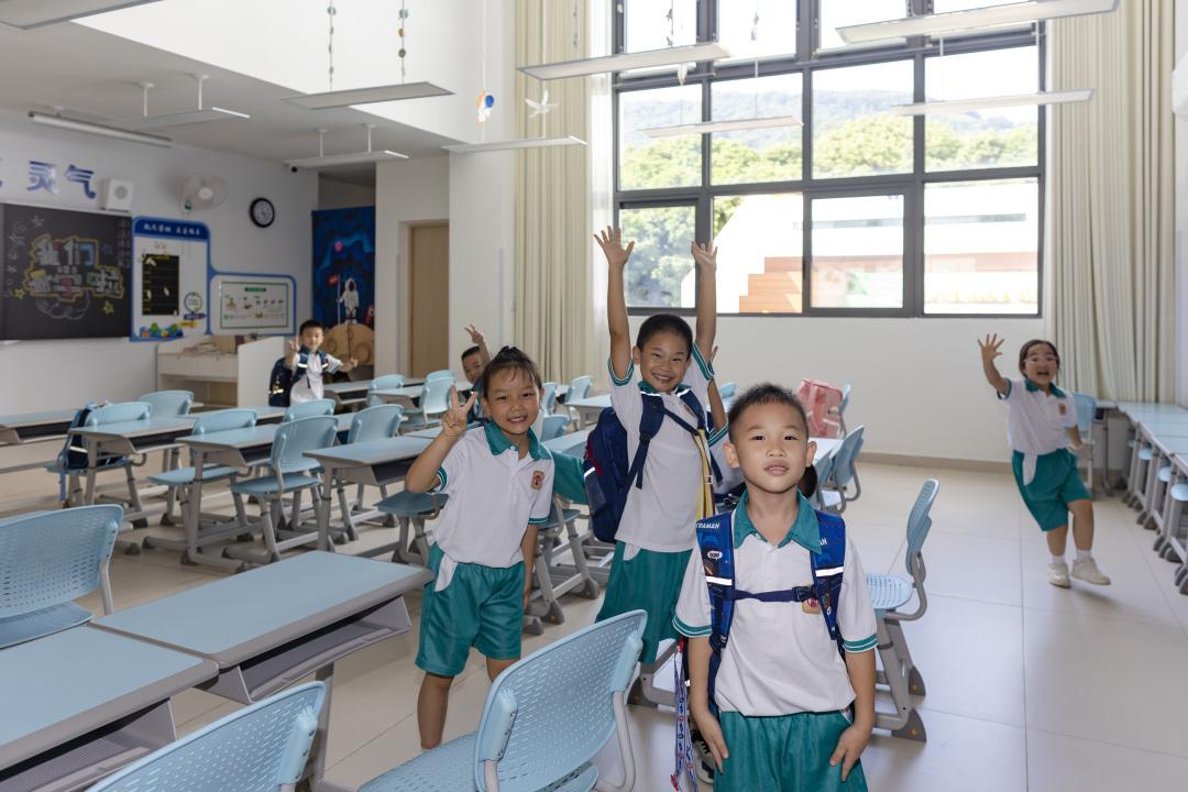 “我们的教室像一栋别墅,还有私家花园!”在位于黄埔区永和街道禾丰片区的广州开元学校西校区,刚上一年级的“元宝宝”们非常自豪。原来,这里的教室面积是传统教室的2倍以上,内外融通、自然采光均匀,有连廊、大阳台、大窗户、弧形吊顶及透光玻璃砖,显得特别“高大上”。